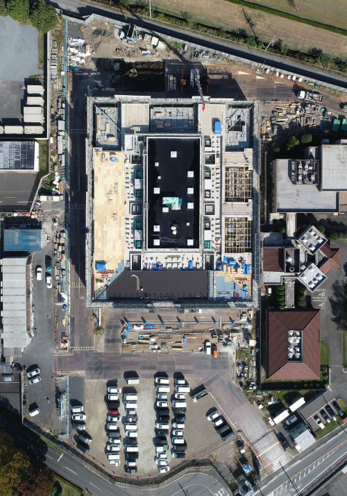 周囲の田んぼは稲刈りも終わり、爽やかな秋空の中工事は進んでおります。毎日多くの職人さん達の手により急ピッチではありますが、しっかりと施工されています。