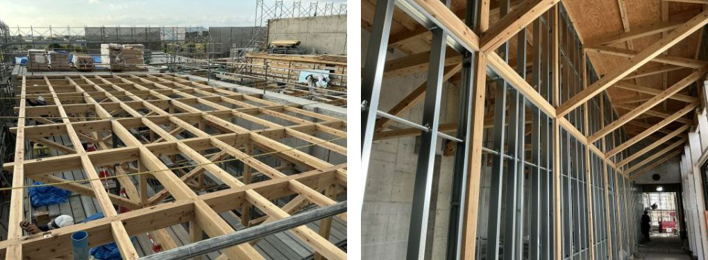 その「一部木造」は2階の柱梁の一部で県産材を利用しています。完成後は梁など仕上げとして見える部分もございますので、木のぬくもりを感じて頂ければと思います。